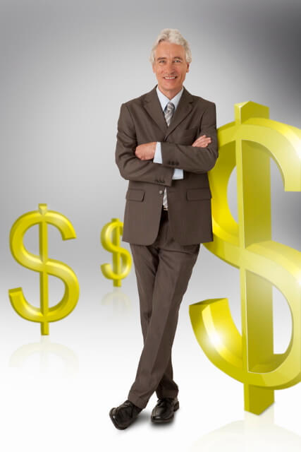 smilling man leaning against a big 3D dollar symbol